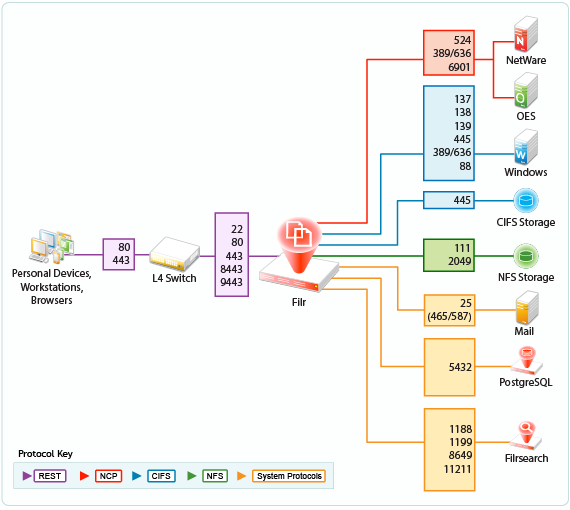 Figure 2-14 illustrates the ports that can be used in Filr deployments, including insecure ports. For information on configuring and securing Filr securely, see DMZ Setup for Filr in the OpenText Filr 23.3: Maintenance Best Practices Guide.