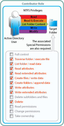 • The basic Modify permission included with the privileges required for the Editor role (Write, Read, Read & Execute, and List Folder Content)