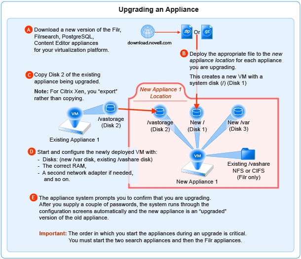 Copying each appliance’s disk is at the heart of the upgrade process because it uses the corresponding old appliance’s configuration settings on Disk 2 to create an upgraded version of the appliance with minimal input on your part.