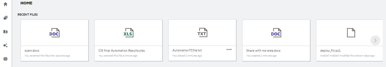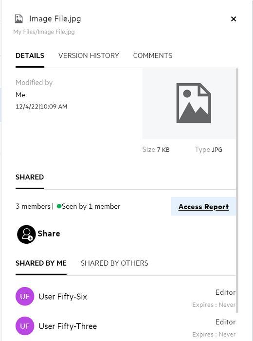 In the Recent Files, the logged-in user can see the recent files accessed. When the file is shared, only the file owner and the recipient can see the files in the Recent List. For example, User A (owner) shares a file with User B. The file is displayed in User A and User B’s Recent Files list. After a few days, if the same file is shared by User A to User C, the shared file is displayed on user A and C’s Recent Files list.