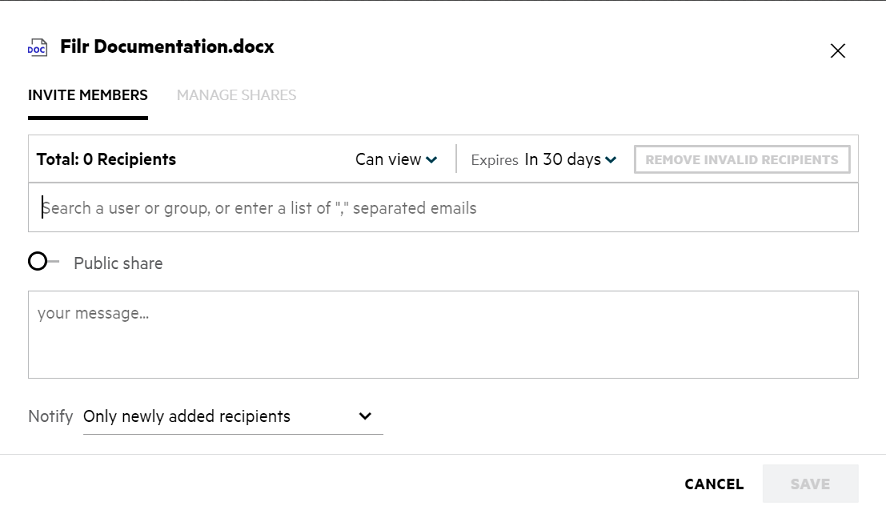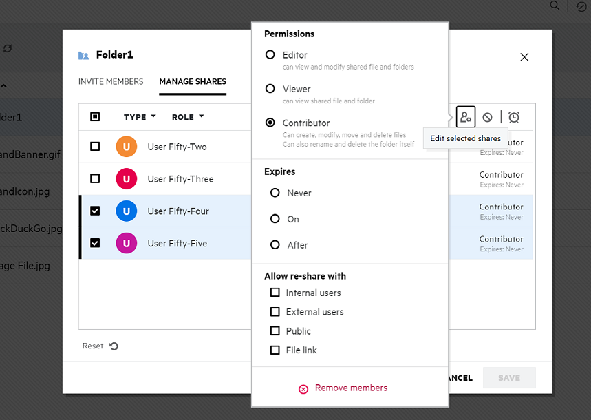 While sharing multiple files or folders, if one file has View right and one folder has Contributor right, then View rights will be considered. You can edit the share permissions by using the Manage shares option in the More Action menu of a file. In the Manage Share dialog box, under Manage Shares tab, select the user/group name and click