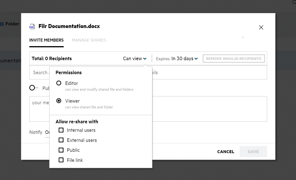 Here you can change the share permissions and the share expiry. Clicking the Reset option will reset the changes made to the old permission settings.
