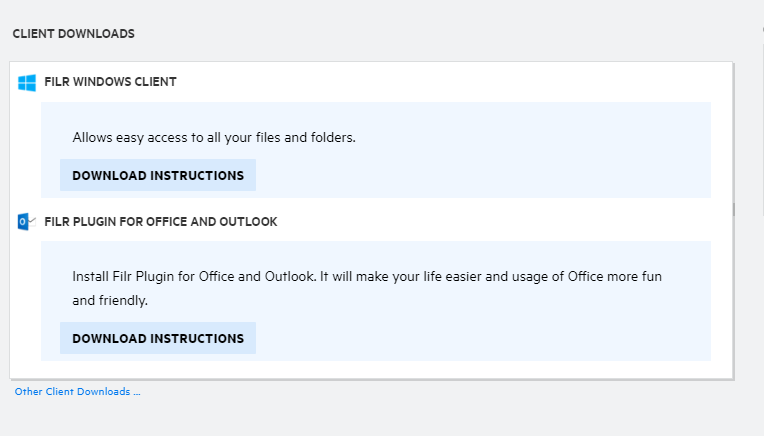 CLIENT DOWNLOADS: Information about the native Filr client, download links to other Filr clients, and Office and Outlook plug-ins.