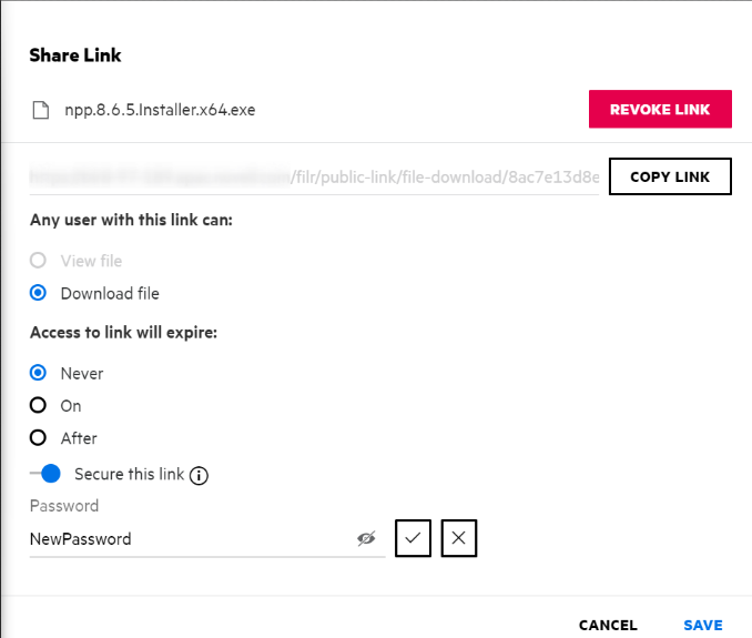 Here, the password is modified, and the already generated link remains the same. If you wish to obtain a new link, click Revoke Link and follow the steps given in How to generate a Share Link or a Password-Protected Share Link?
