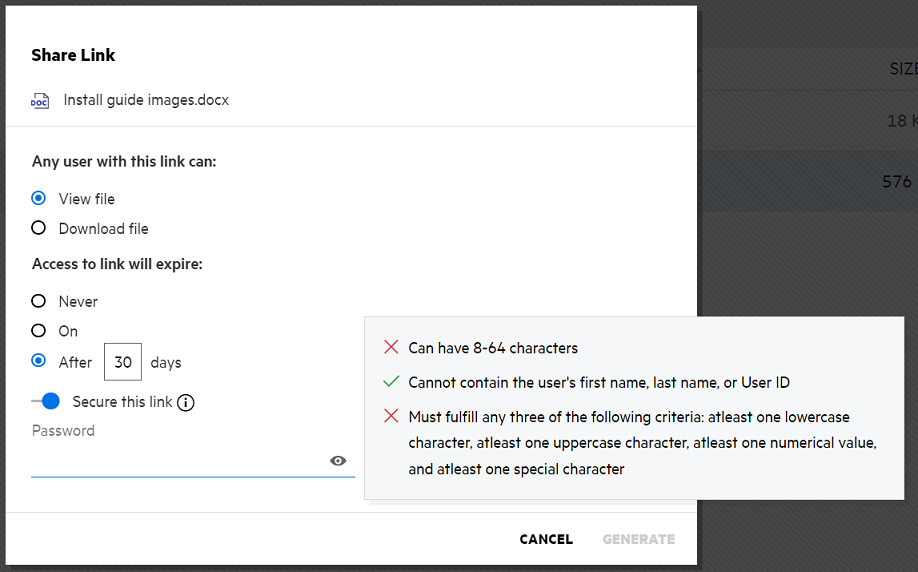 Password - Enter the password for the share link to be generated for the file. If Apply Filr's Password Policy when setting passwords for Share Links is enabled in the Administrator Console, the set password has to adhere to Filr’s password policy.