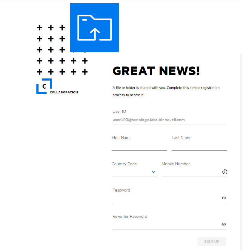 When a file is shared with a user outside the organization, the user has to log in to the Filr application to access the file. When the file is shared, an email is sent to the users outside the organization (external user) with the link to a self-registration form. The user has to register the details in the form and complete the self-registration process to be able to log in to the Filr application. The form looks as shown below:
