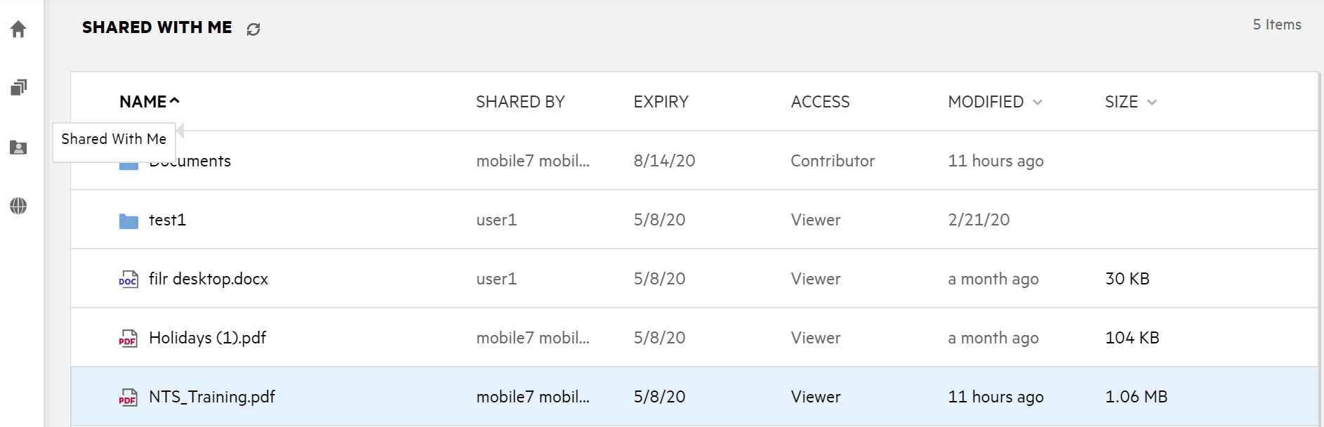The Shared With Me includes the following columns: