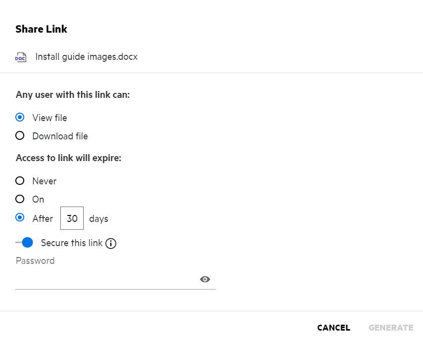 Secure this link - Turn on this toggle button to secure the share link. This option is displayed if the Allow Share Links to be password-protected option in the Share Link Settings in the Administrator console is enabled. This allows you to set the password for the link. You have to provide the password along with the link to one or more recipients to access the link. You can set the password when creating or modifying a Share Link.