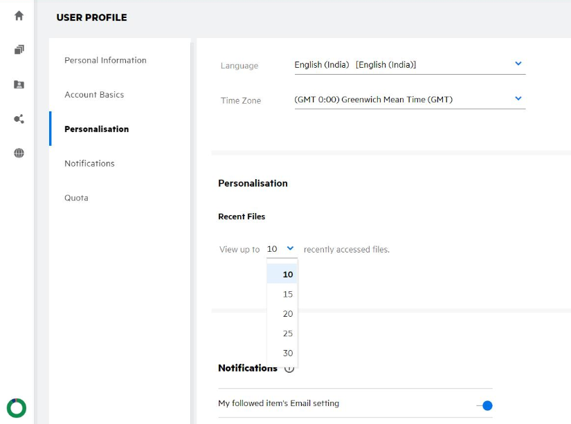 The number of files to be displayed on the Recent List is configurable. To configure the settings, navigate to your User Profile.