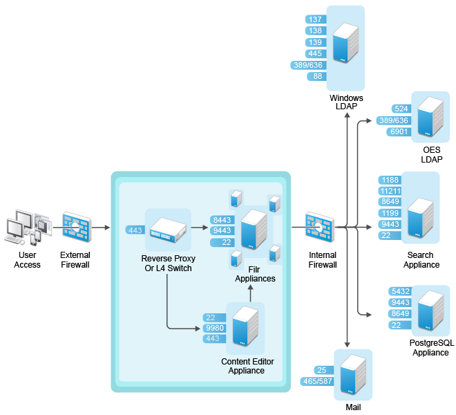 Figure 16-1 illustrates a basic setup with Filr running in a DMZ, including information about the ports that you need to open for the firewalls and for communication between the various servers.