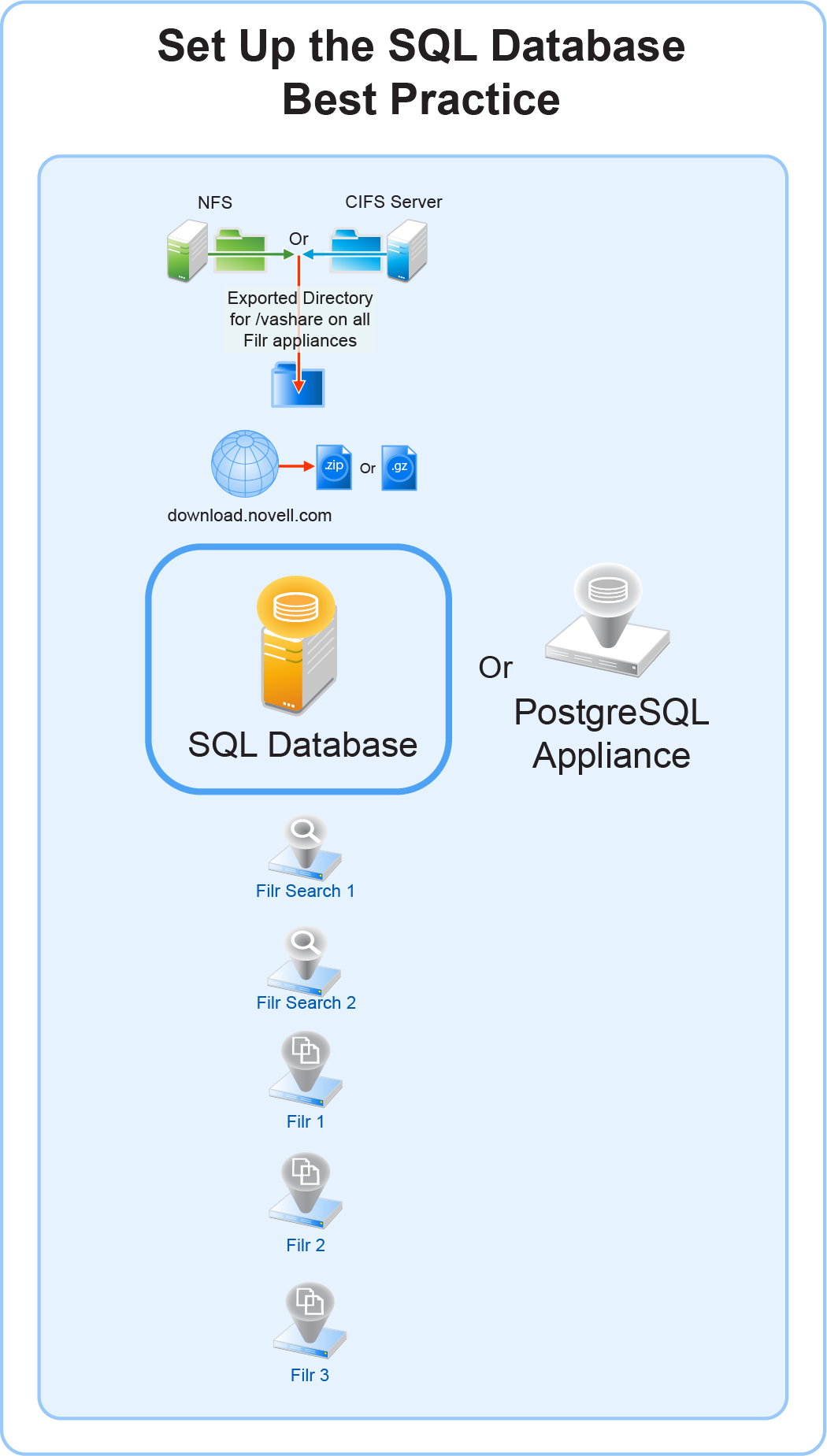 Figure 8-3 illustrates that an SQL database is the second component deployed (after shared storage) when creating an expandable Filr deployment.