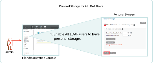 If personal storage is enabled, then space is allocated to users for personal storage. Figure 9-2 illustrates how to enable personal storage for all of the LDAP users on the Filr site.