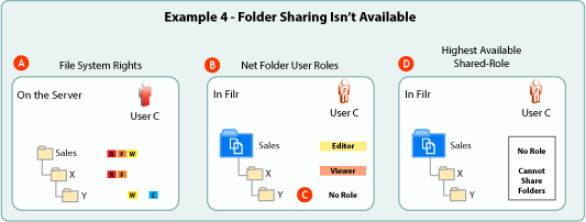 Because the lowest role that User C has in the Sales Net Folder is No Role, and because a shared-access role assignment must be made when sharing a folder, User C cannot share the Sales Net Folder. The same restriction would apply to attempts to share folder X. |