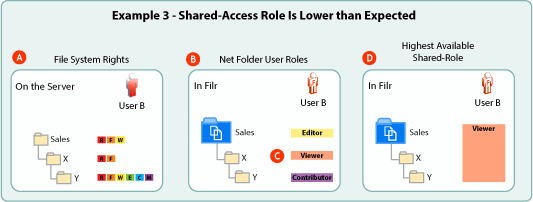 Because the Editor shared-access role is the minimum shared-access role in the Net Folder (letter B), User A can only assign the Editor shared access role when sharing the Net Folder and share recipients could only exercise Editor-level rights in folders X and Y. |