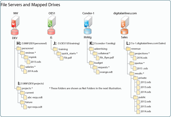 To understand Net Folders, it is useful to see the similarities and differences between them and the mapped drives that you probably have on your current network. Figure 10-1 and Figure 10-2 illustrate such a comparison.