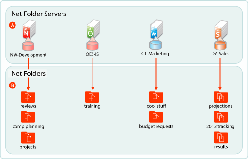 A Net Folder is a pointer or reference to a specific folder within a Net Folder Server. Often there is just one Net Folder for every Net Folder Server, but you can create multiple Net Folders that point to a single Net Folder Server. You can even create multiple Net Folders that point to the same relative path. Why might you want to duplicate Net Folders? Possibilities include the following: