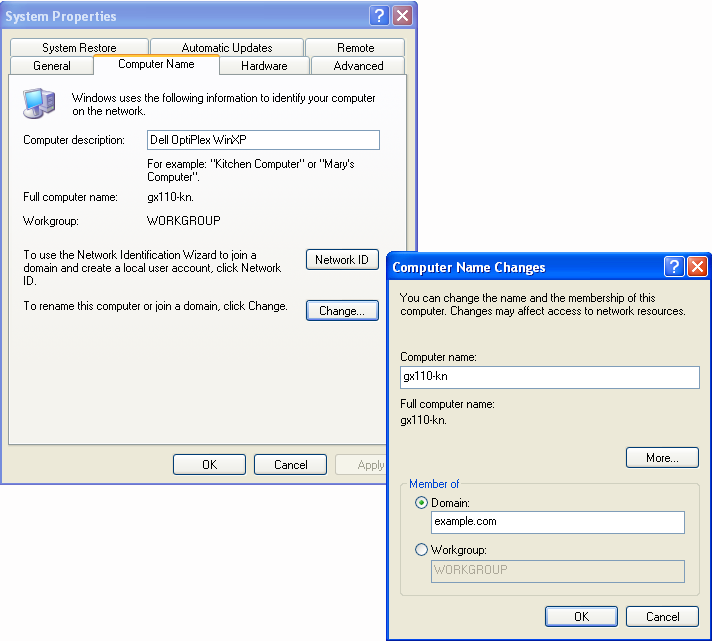 NOTE:When you install Windows XP, it prompts you to select whether it is part of the workgroup or the domain. If domain is selected, it reports that an invalid domain is specified. However, if there is an existing Windows XP machine installed, it is possible to join this workstation to the domain.