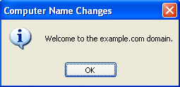 8. A welcome message is displayed after the computer has successfully joined the domain. Click OK to continue.