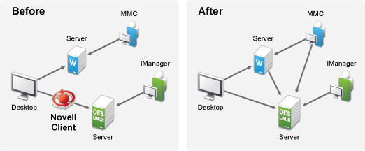 When deployed in an environment that also supports NetWare Core Protocol (NCP), DSfW supports cross-protocol locking. Whether customers decide to use only Windows clients, NCP clients, or a combination of both, access rights for files is enforced by the OES Storage Services (NSS) file system. Client for Open Enterprise Server does not need to be installed and managed as an extra software on the desktop. This helps in streamlining user experiences in terms of login to the directory and single login facility to both Active Directory applications and eDirectory services.