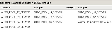 For example, the following report shows the members for Groups A, B, and D. Group C has no defined members. The AUTO_POOL_12_SERVER resource belongs to two RME Groups. It has mutually exclusive relationships with two different groups of resources. These exclusions are managed separately.