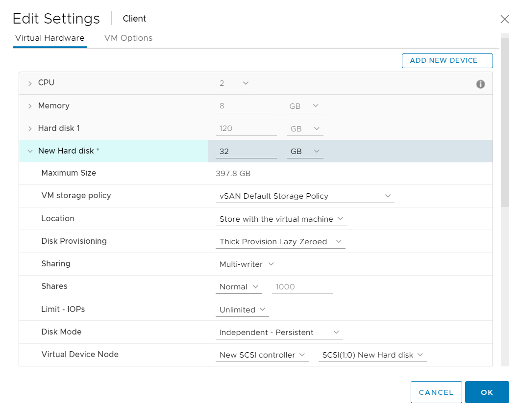4. Click ADD NEW DEVICE > Hard Disk with the following settings.
