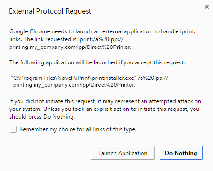 Click Launch Application on the External Protocol Request dialog box to proceed with the installation of the printer.