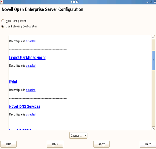 To change the default configuration settings for iPrint, click the iPrint service, or click Next to continue with the default configuration.