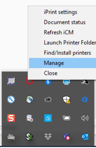 Right-click the Micro Focus iPrint Client tray icon in the system tray on the taskbar and choose Manage. The iPrint Management Client is launched.