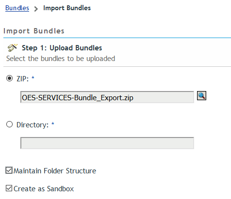 Check Maintain Folder Structure before you browse for any of the zip files in the copied folder. For example, to import all configuration bundles for OES services select OES-SERVICES_Bundle_ Export.zip, select Upload and once the upload is completed verify that Maintain Folder Structure is checked before you select Next.