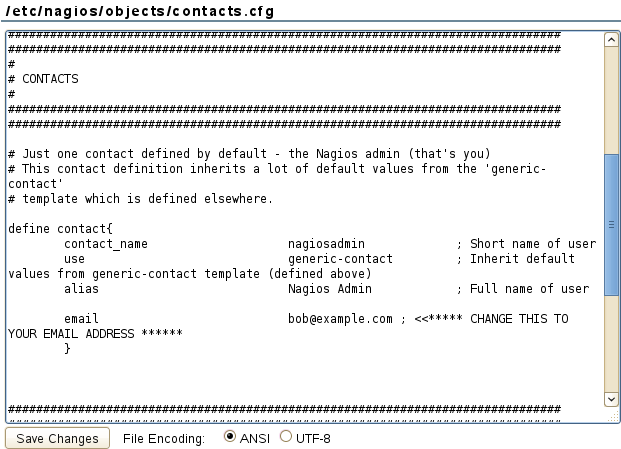 This opens the /etc/nagios/objects/contacts.cfg file in the OES Remote Manager text editor.