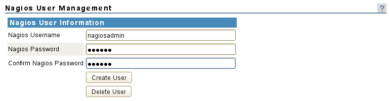 Create a Nagios user name and password, or delete a Nagios user. You can also use this option to create the user name with a different password.