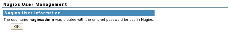 7. When a message confirms that the user nagiosadmin was created in Nagios with the password you provided, click OK to dismiss the message.