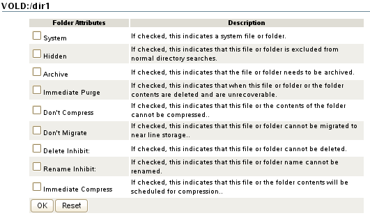 Click a directory’s Attributes link to view or modify the NSS file system attributes that are set for the directory. Click OK to save your changes.