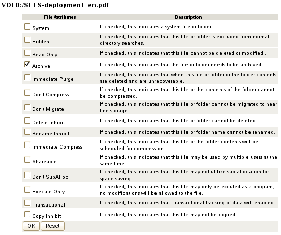 Click a file’s Attributes link to view or modify the NSS file system attributes that are set for the file. Click OK to save your changes.