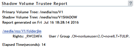 A volume’s trustee report shows the rights settings by folder for each user or group that is a trustee on the NSS volume. For example, the following trustee report shows the rights for a folder in a Dynamic Storage Technology shadow volume.