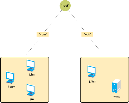 The domain names in the figure end with a period, representing the root domain. Domain names that end with a period are called fully qualified domain names (FQDNs).