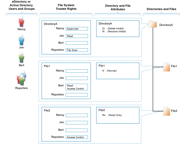 For example, even though Nancy has the Supervisor (all) trustee right at the directory (and, therefore, to the files it contains), she cannot delete File2 because it has the Read Only attribute set.