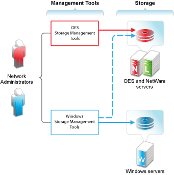 Network administrators use native OES and Windows storage management tools to create and manage storage devices on OES and Windows servers, respectively.