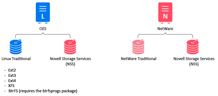 As shown in Figure 11-1, both OES and NetWare support Novell Storage Services as well as their traditional file systems.
