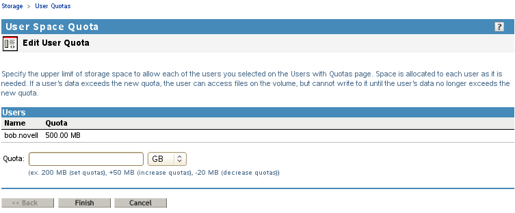 Edit user quota: Select the check box next to the user name, click Edit, specify a quota, then click Finish. The user name appears in the list with the modified user quota information for the volume.