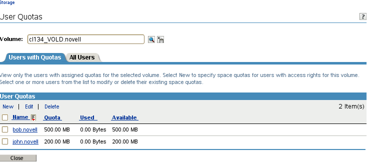 Add user quota: Click New, browse to select the user, specify a quota, then click Finish. The user name appears in the list with the user quota information for the volume.