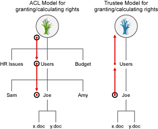 Figure 5-7 File System Tree View of a Shared File for Joe with the Trustee versus ACL Methods