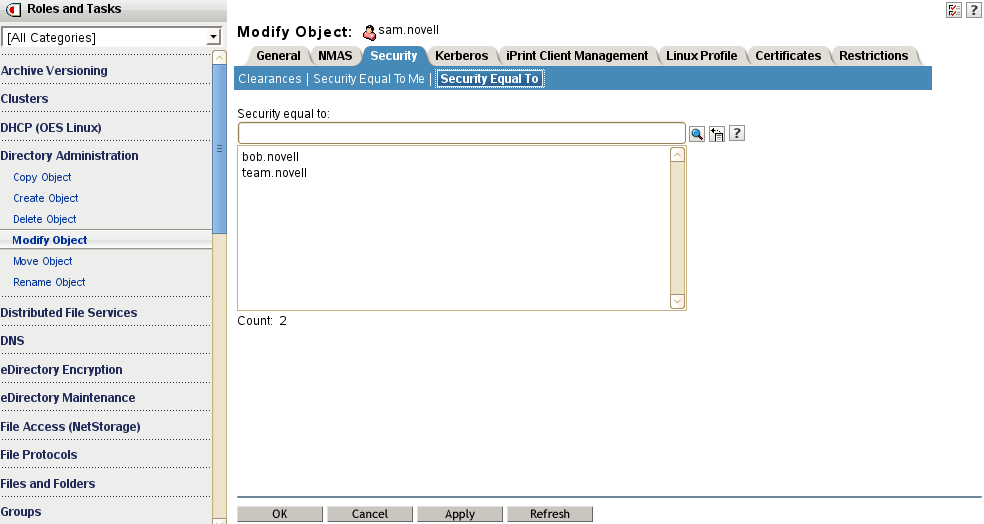 For example, in iManager, you can use the Directory Administration > Modify Object option to make a User object named sam to be the security equivalent to the User object named bob, as shown in Figure 5-3. After you create the security equivalence, sam effectively has the same rights to the file system tree as those explicitly assigned to bob.