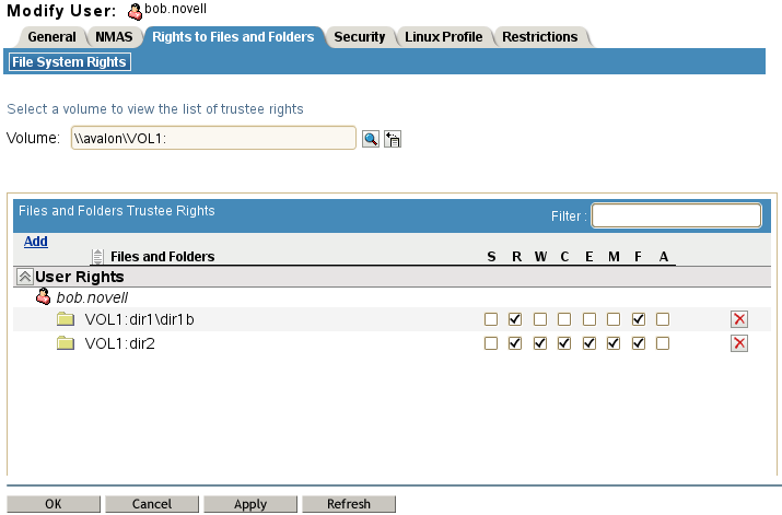 Files and Folders: The files and folders that the selected trustee is allowed to use. You can assign or modify the rights for the selected trustee on each file or folder.