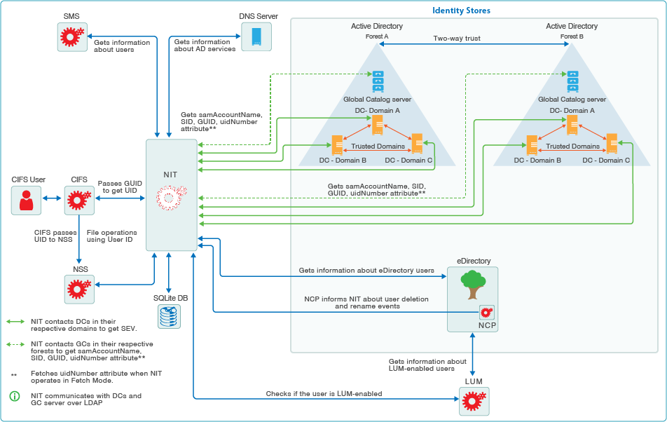 nit daemon: Serves requests from CIFS, NSS, SMS, and other OES services to map and resolve eDirectory and Active Directory user identities as applicable.
