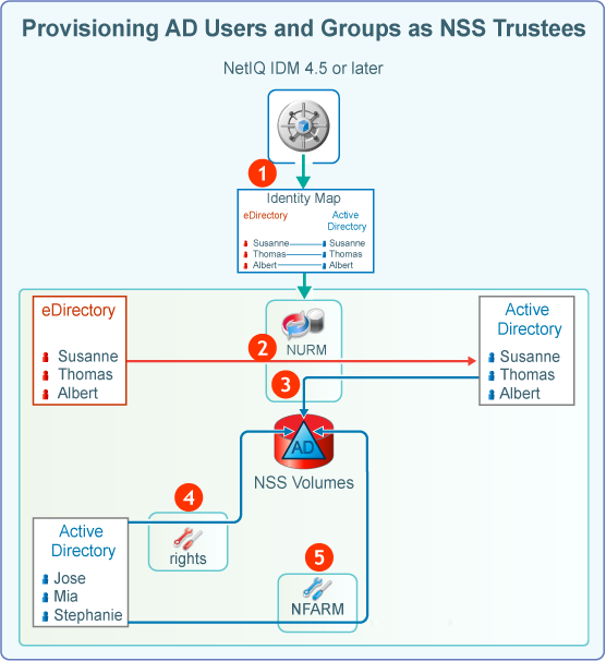 • If you have NetIQ IDM 4.5 or later, and you have created an Active Directory to eDirectory user map using IDM Designer (not the IDM iManager plug-in), the User Resource Map utility (NURM) can leverage the map for replicating NSS ACLS for eDirectory users and groups to NSS ACLs for corresponding AD users and groups.