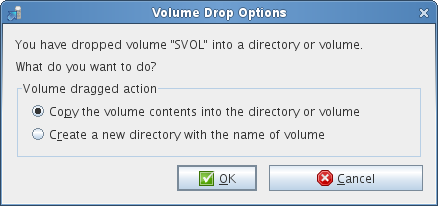 In the Volume Information tab, in the Source Server tree, select volumes or folders that you want to migrate, then drag and drop it in the Target Server tree. The Volume Drop Options dialog-box is displayed. Select Copy the volume contents into the directory or volume option under Volume dragged action and click OK.