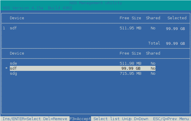 From the list of available devices, select the device that you initialized in Initializing a SAN Device, such as sdf, then press Insert or Enter to select the device. You can select an unshared initialized device, a shared device with no data partitions, or an uninitialized device. Only qualified devices are available in the list. For OES 11 SP1 and earlier, the device must already be initialized, contain no partitions, and must not be marked as shareable for clustering. The LVM volume group requires the entire device. You cannot specify the amount of space to use. The device’s free available space is displayed in the Free Size field.