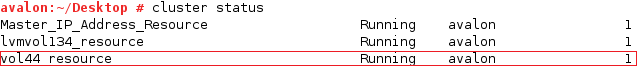 The resource is named <lv_name>_resource. In the following example, vol44_resource is in the Running state.