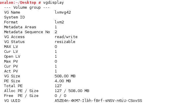 nlvm create linux volume type=xfs device=sde size=511M mp=/mnt/vol42 mntopt=rw lvm name=lvmvol42 group=lvmvg42